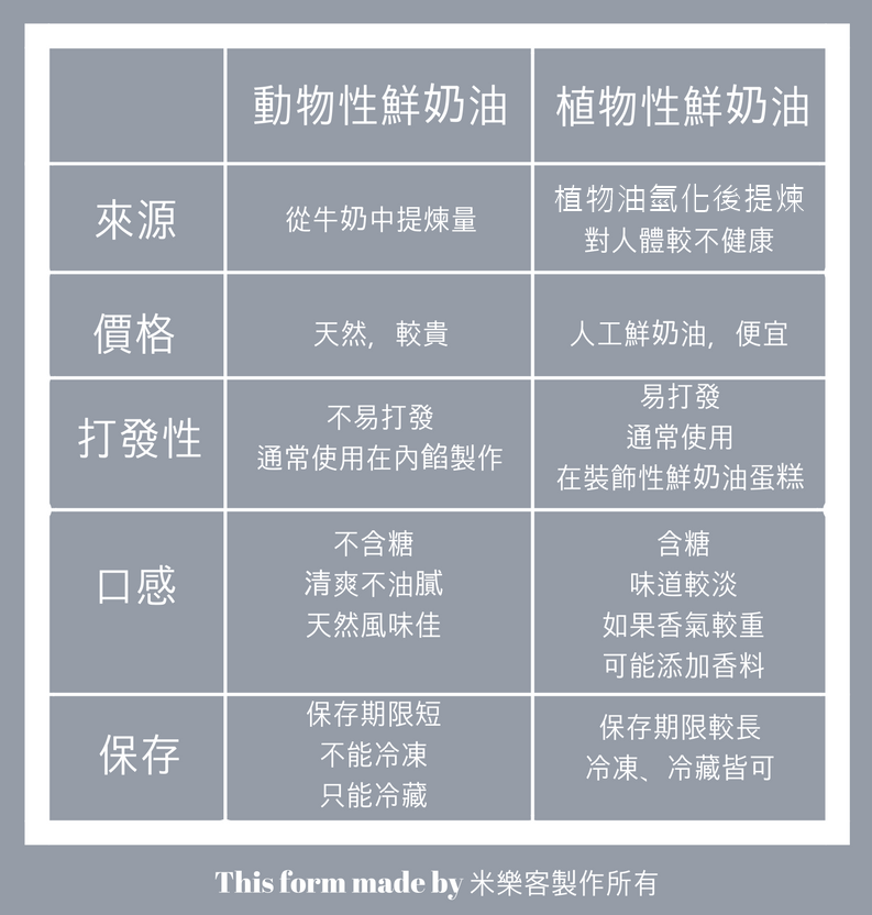 而市面上的植物性鮮奶油:是用植物油去氰化後,製作出含有反式脂肪酸的鮮奶油,特色是不易融化、適合做造型蛋糕。