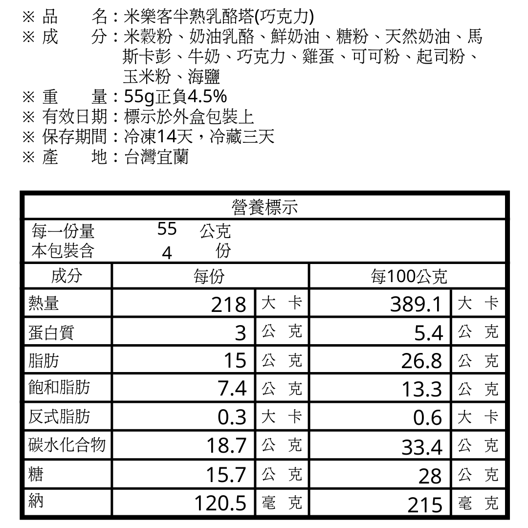 ※ 成 分:米穀粉、奶油乳酪、鮮奶油、糖粉、天然奶油、馬斯卡彭、牛奶、巧克力、雞蛋、可可粉、起司粉、玉米粉、海鹽
