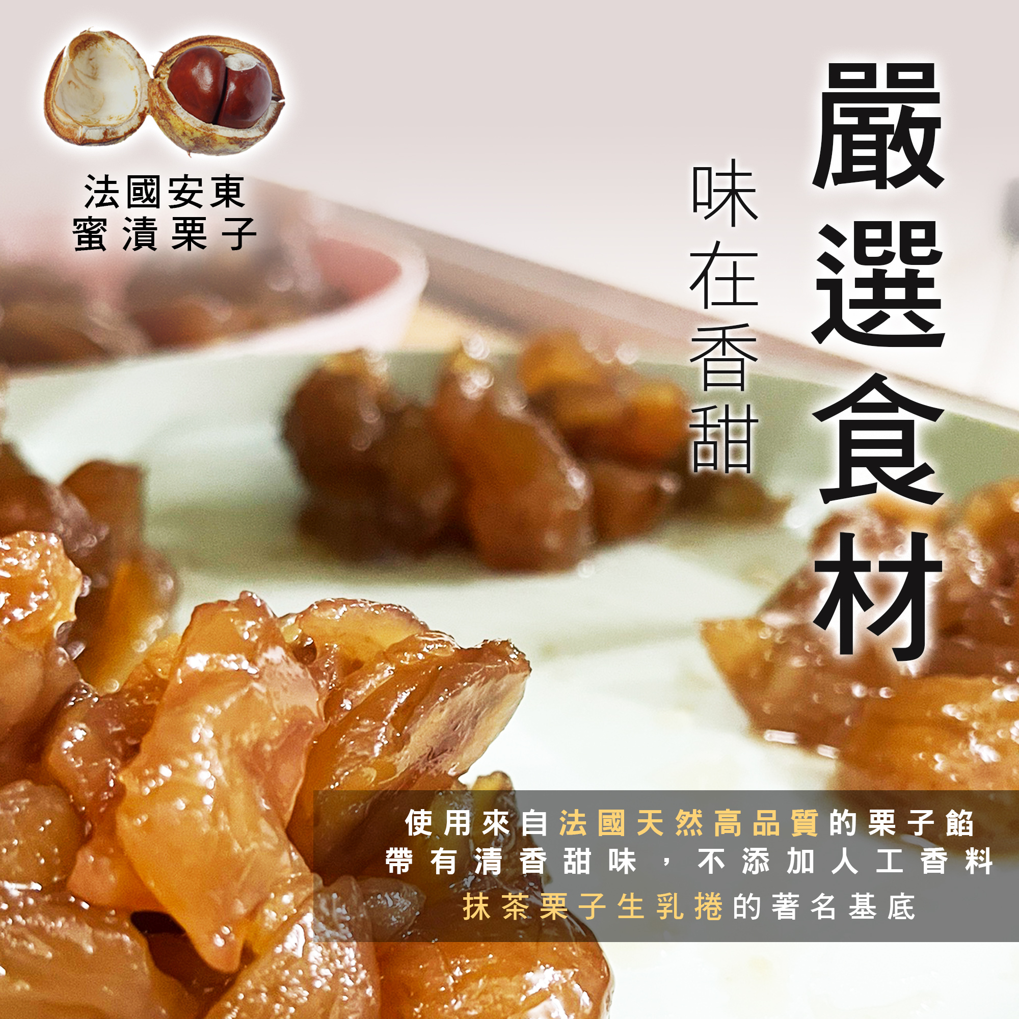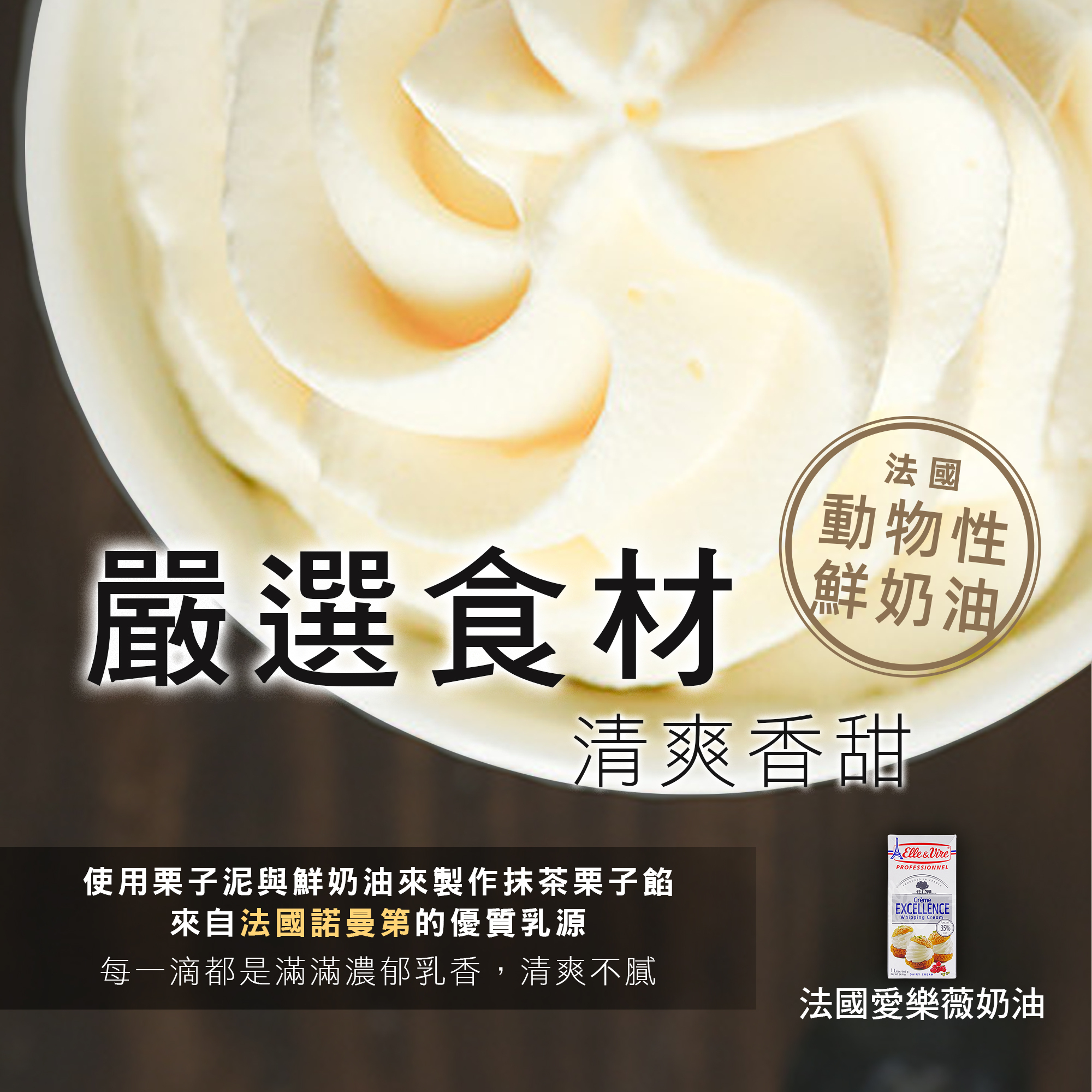 ※ 成分 :雞蛋、鮮奶油、砂糖、牛奶、米穀粉、栗子粒、非基改芥花油、抹茶粉、蜂蜜