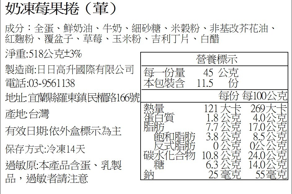 ※ 成分 :雞蛋、牛奶、鮮奶油、砂糖、米穀粉、草莓果泥、覆盆子果泥、非基改芥花油、紅麴粉、吉利丁