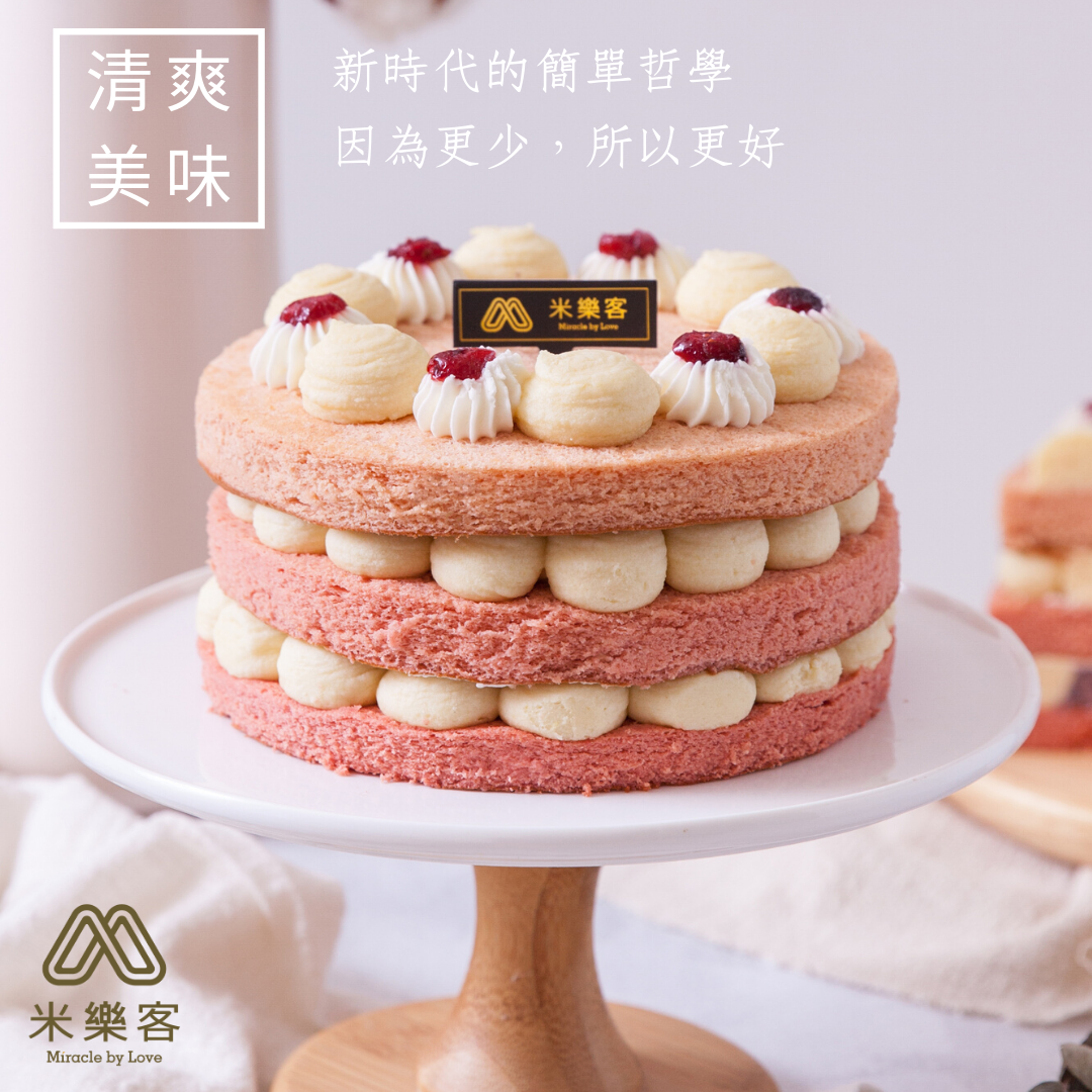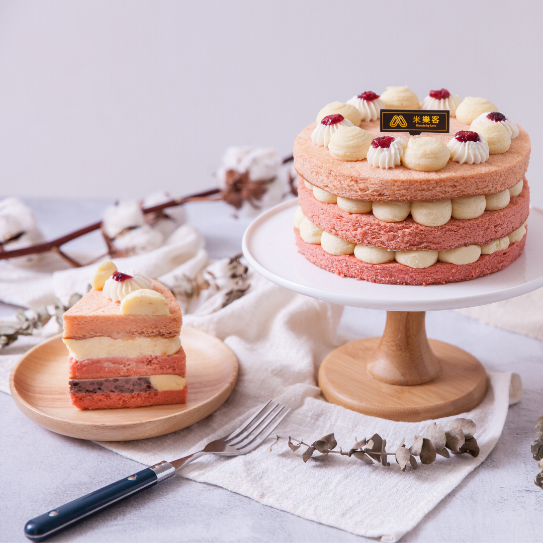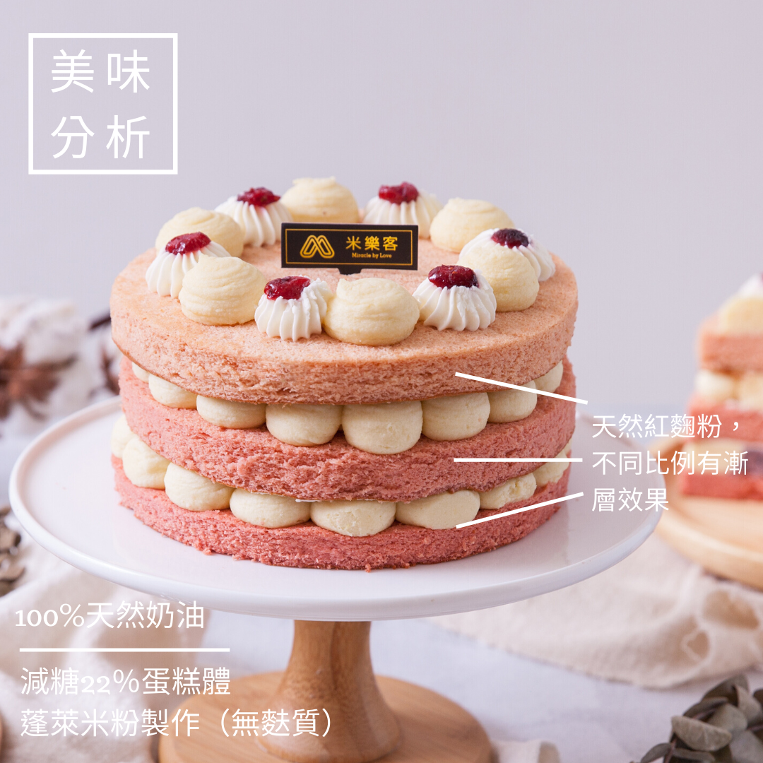 這是一款粉色系列裸蛋糕,用天然紅麴粉以不同比例去調色,打造出三層漸層的蛋糕體,視覺上是一種享受。