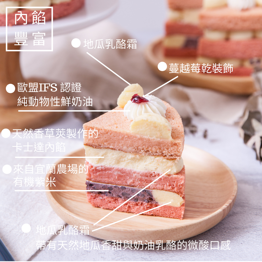 我們也喜歡養生健康的好食材:內餡以台灣最佳農產品地瓜做奶油乳酪霜、使用宜蘭有機紫米做成米布丁