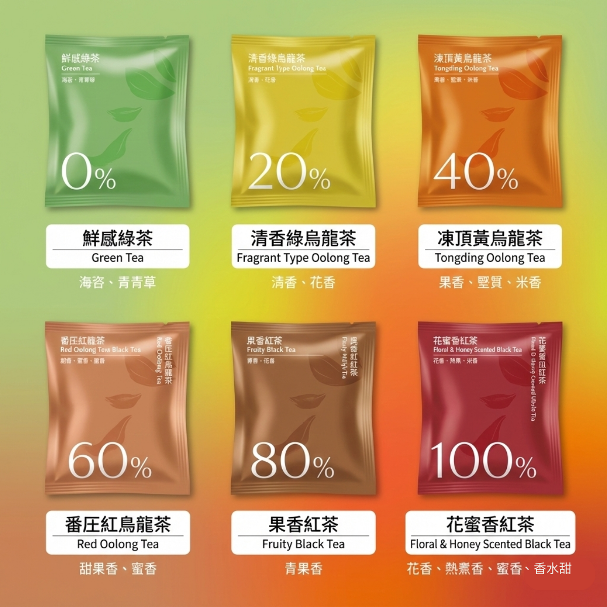 從清新的 0%綠茶,到飽滿的 100%花蜜香紅茶: